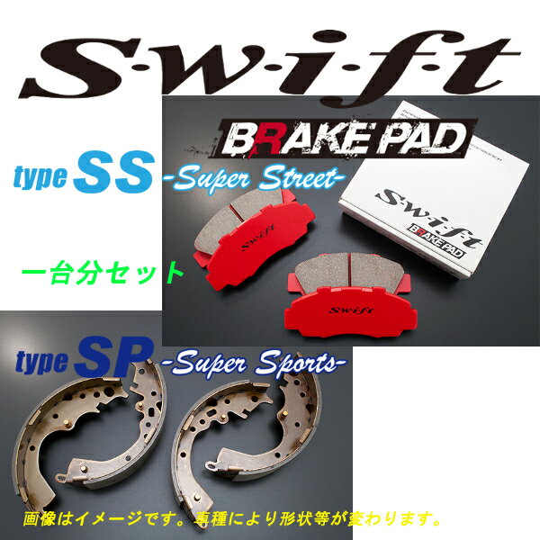スイフト swift ブレーキパッド「type SS スーパーストリート」 フロント用と、「type SP スーパースポーツ」リアシューセット◆ストリートで重視されるブレーキの鳴きや、ホイール汚れの低減を最大限に可能としたスポーツブレーキパッドと、幅広いステージに対応したスポーツリアシューのセットです。